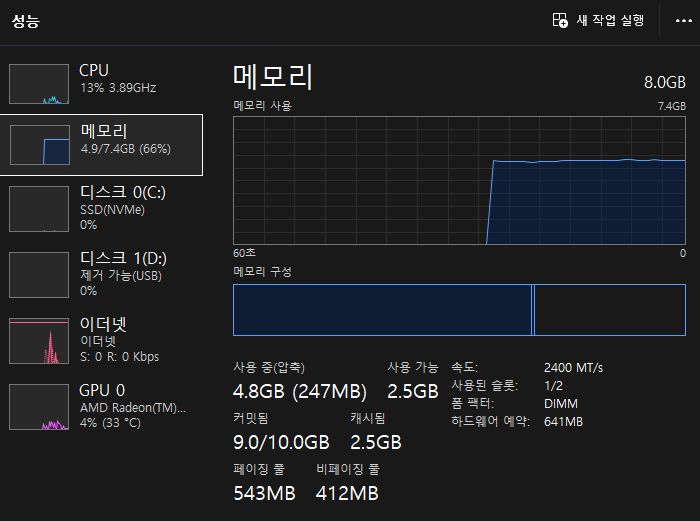 RAM 8GB에서도 메모리가 여유가 있다는 것이 놀랬다.
