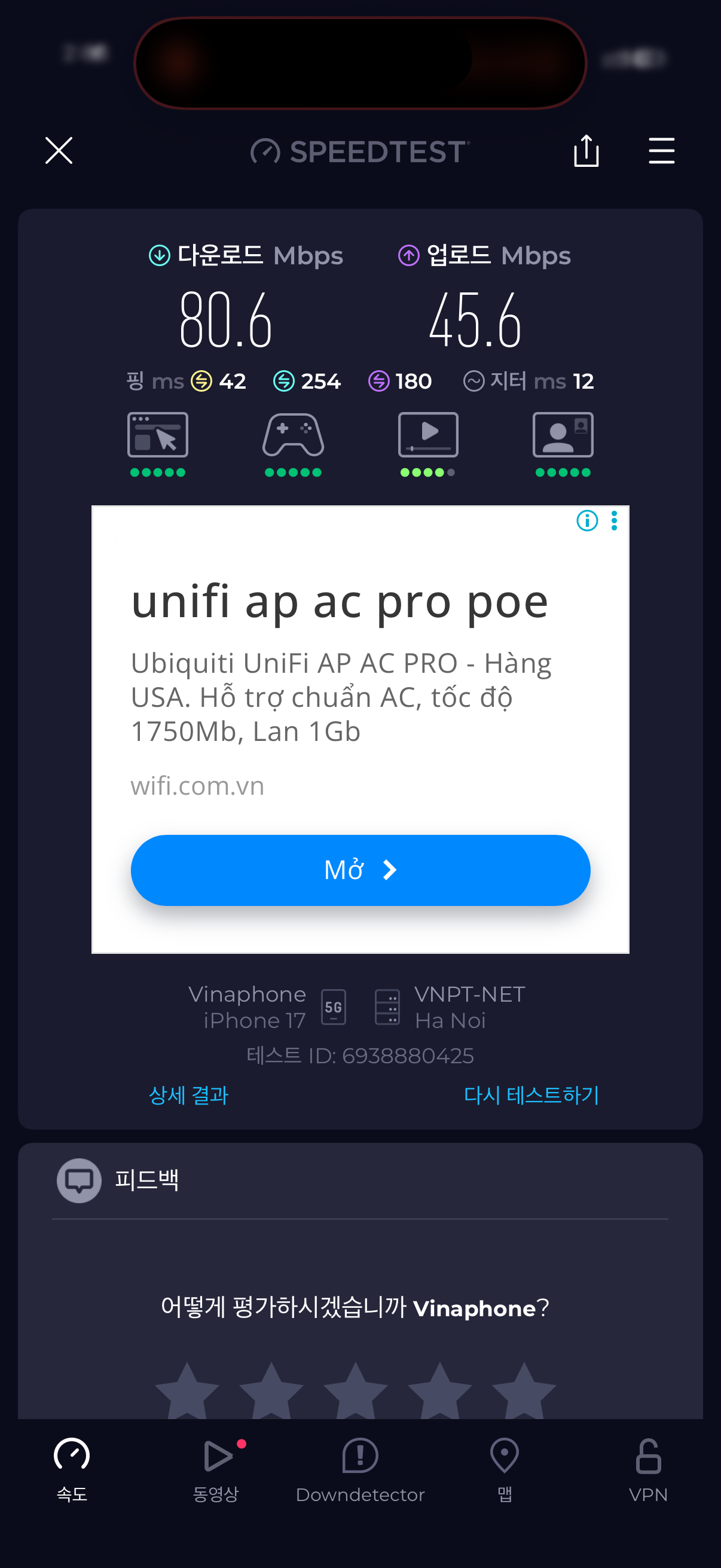 숙소 WIFI를 잡아도 객실마다 WIFI가 제공되는 것이 아니라서 인터넷 속도가 비슷하게 나왔습니다.