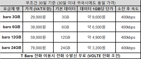 Tbaro 요금제는 5박 3일 동안 있을 건데 30일 치의 요금을 지불해야 하기 때문에 요금제가 너무 비싼 편입니다.