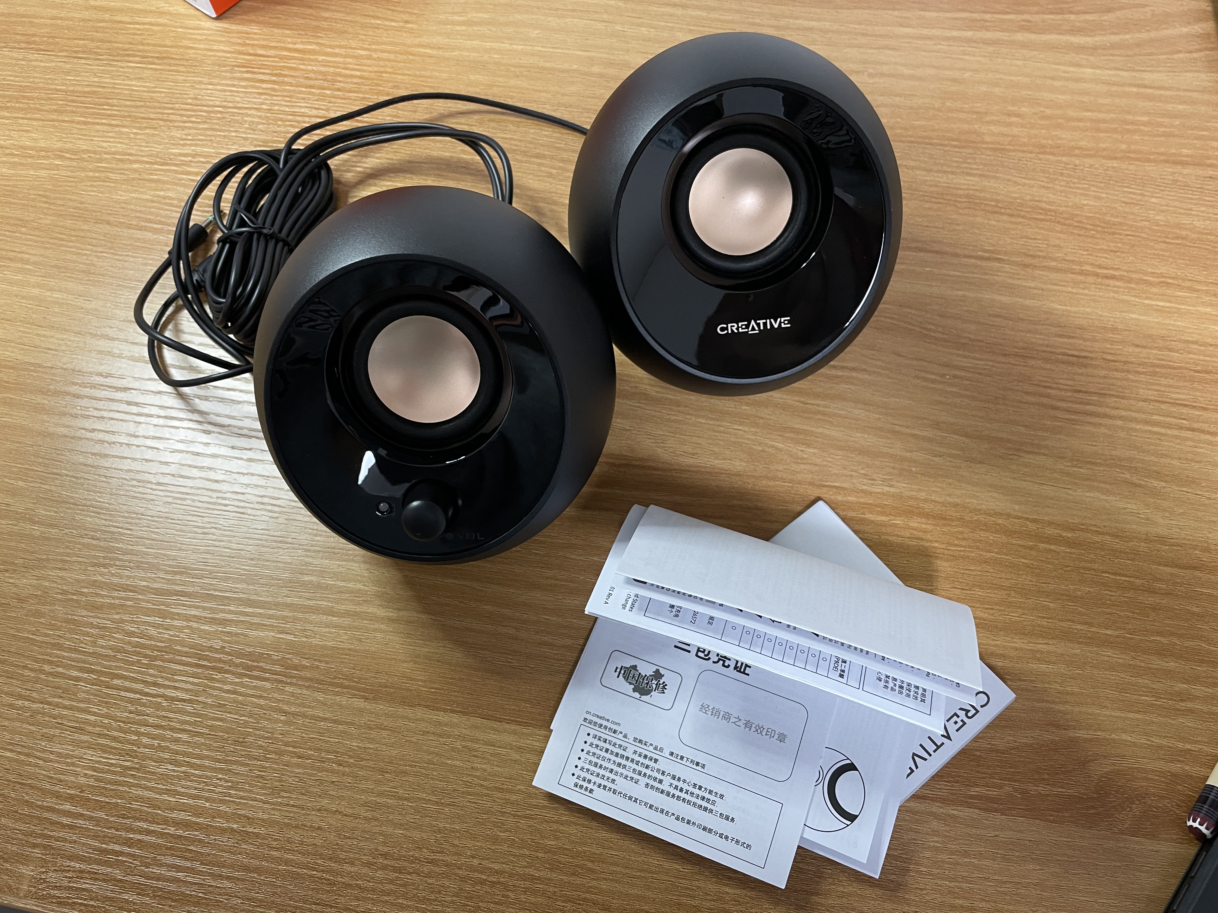 오른쪽 스피커에 음량 조절 노브가 있으며