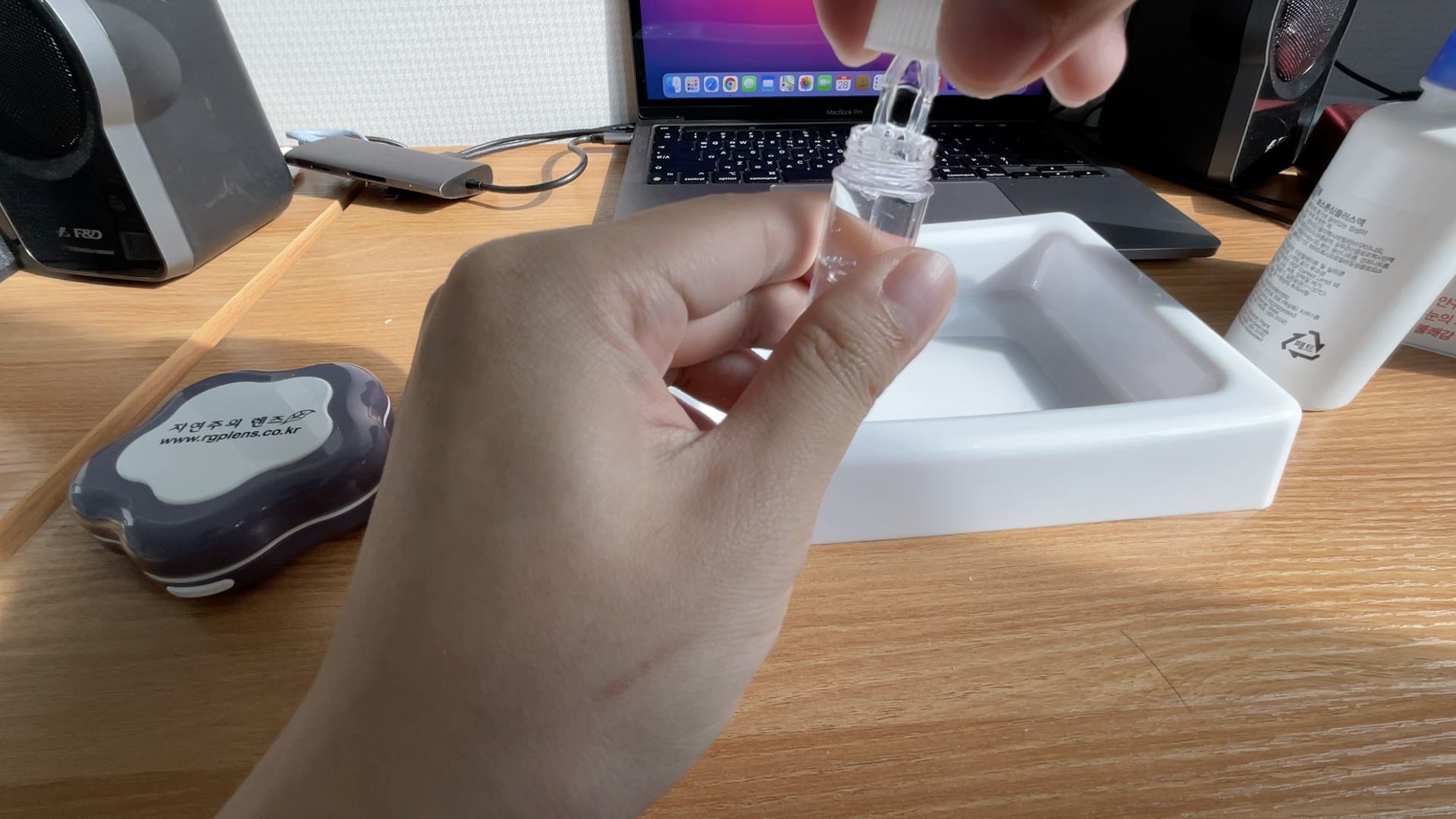 다목적 용액을 2~3방울 정도 렌즈에 떨어뜨려 줍니다.