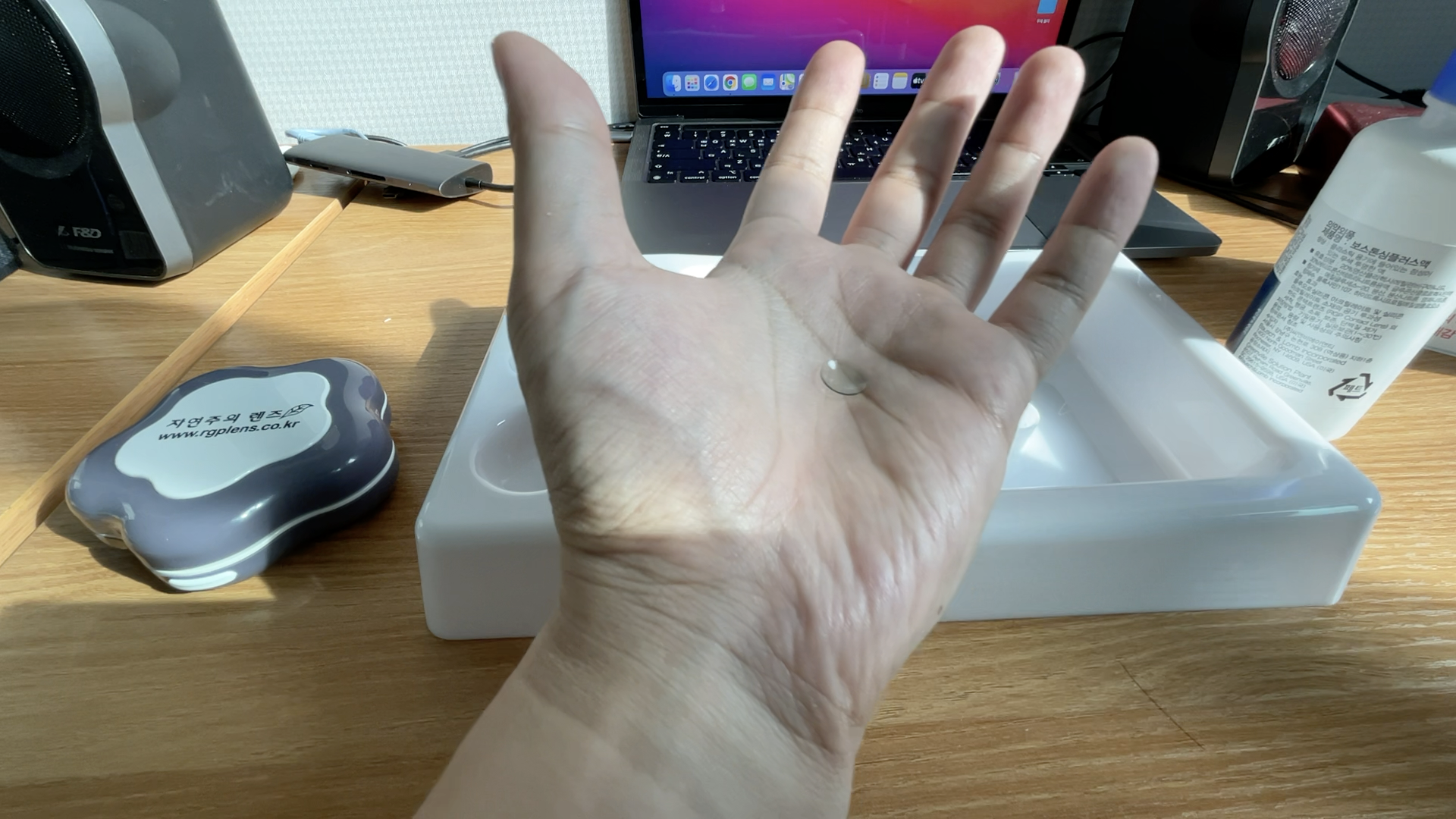 손바닥 위에 렌즈를 오목한 면이 위로 올라가도록 올러둡니다.