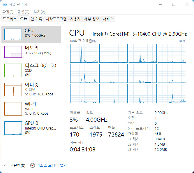 시스템 자원이 남는 것을 볼 수 있습니다.