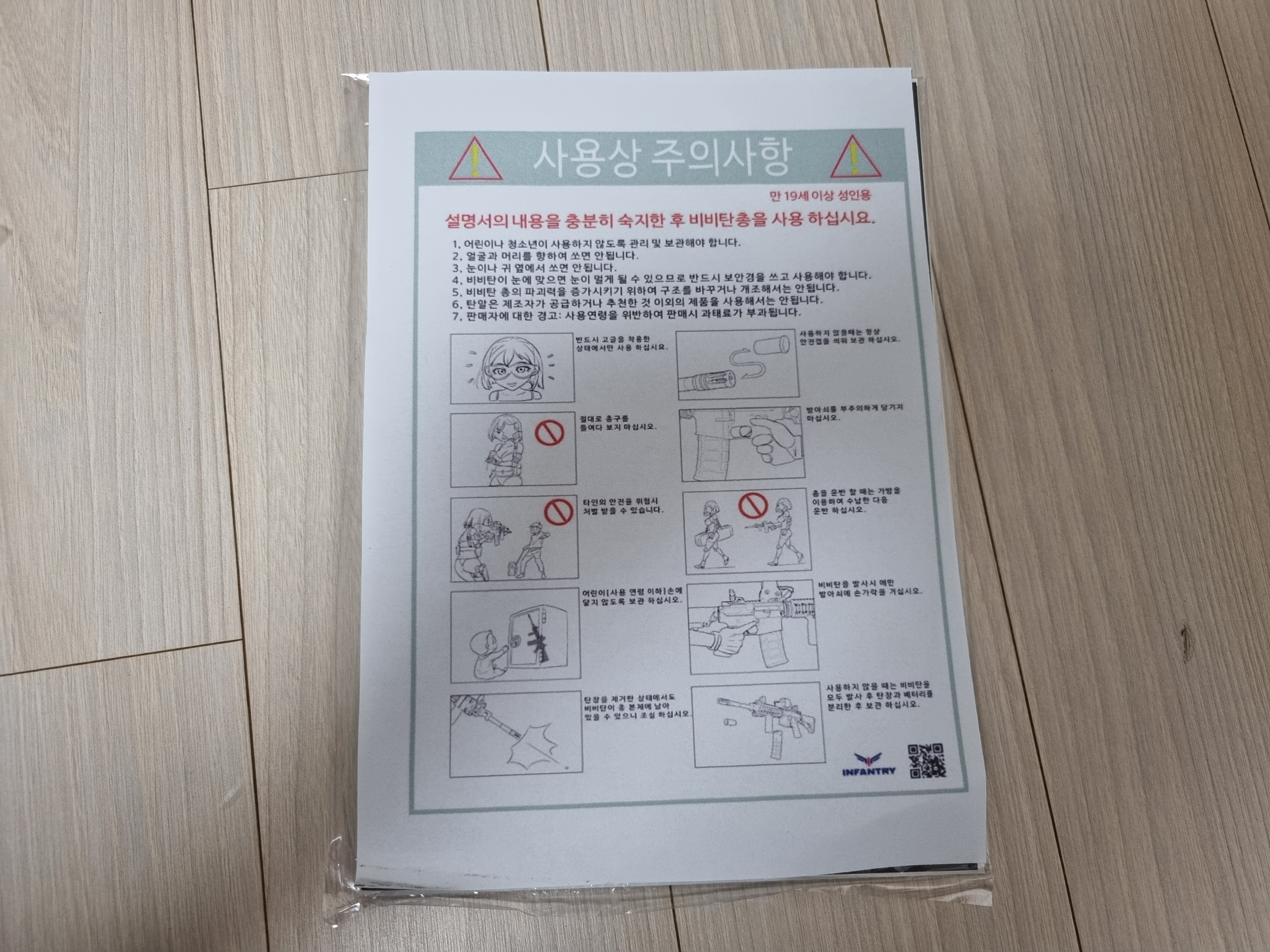 사용설명서와 주의사항이 적혀 있는 종이가 있습니다.