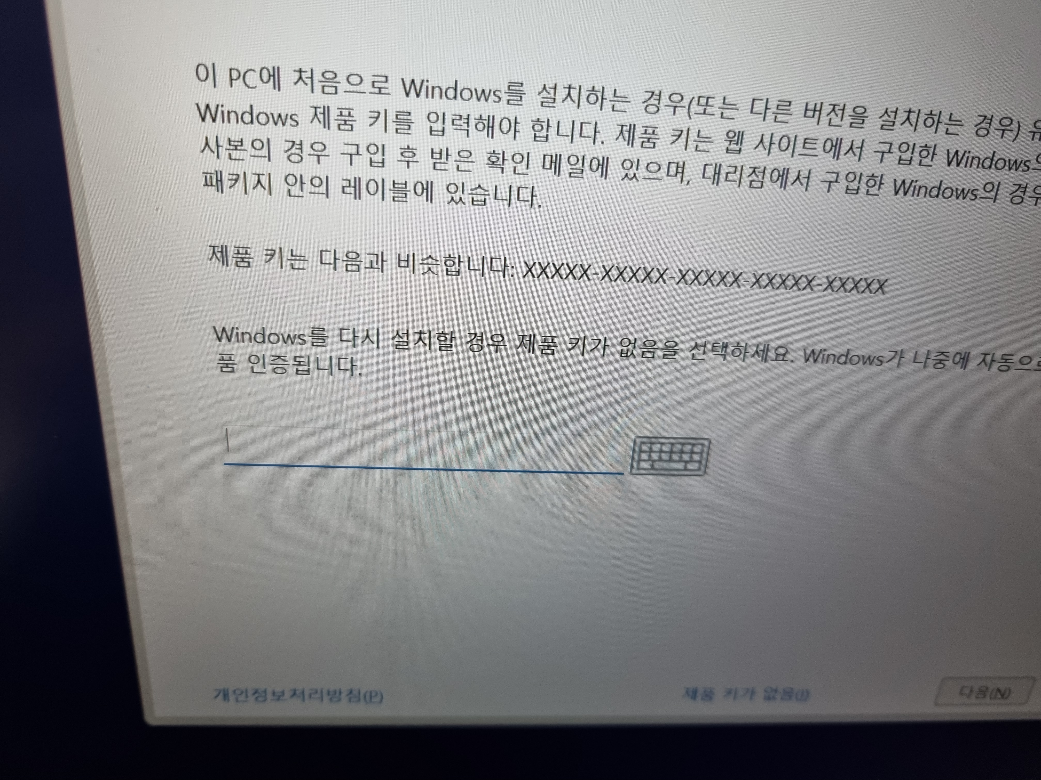 윈도우 정품 키 입력란에