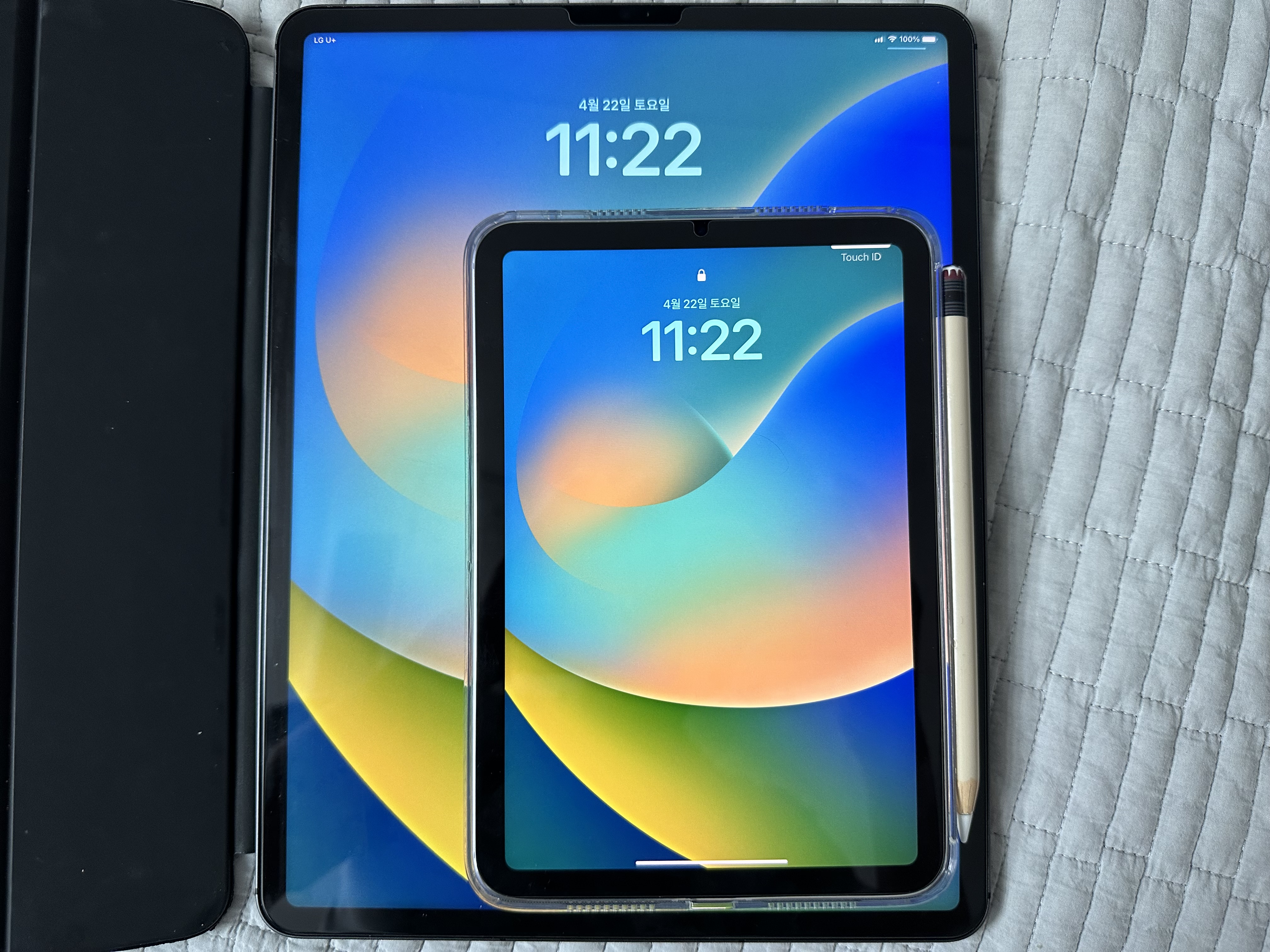 아이패드프로 5세대 12.9인치와 아이패드미니 6세대 비교 사진입니다.