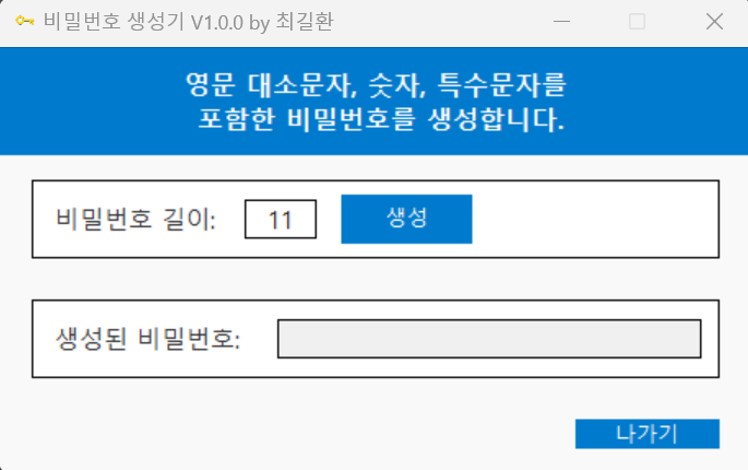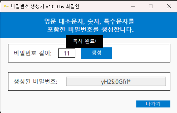 생성버튼을 누르면 비밀번호가 무작위로 생성되며 클립보드에 자동으로 복사가 됩니다.