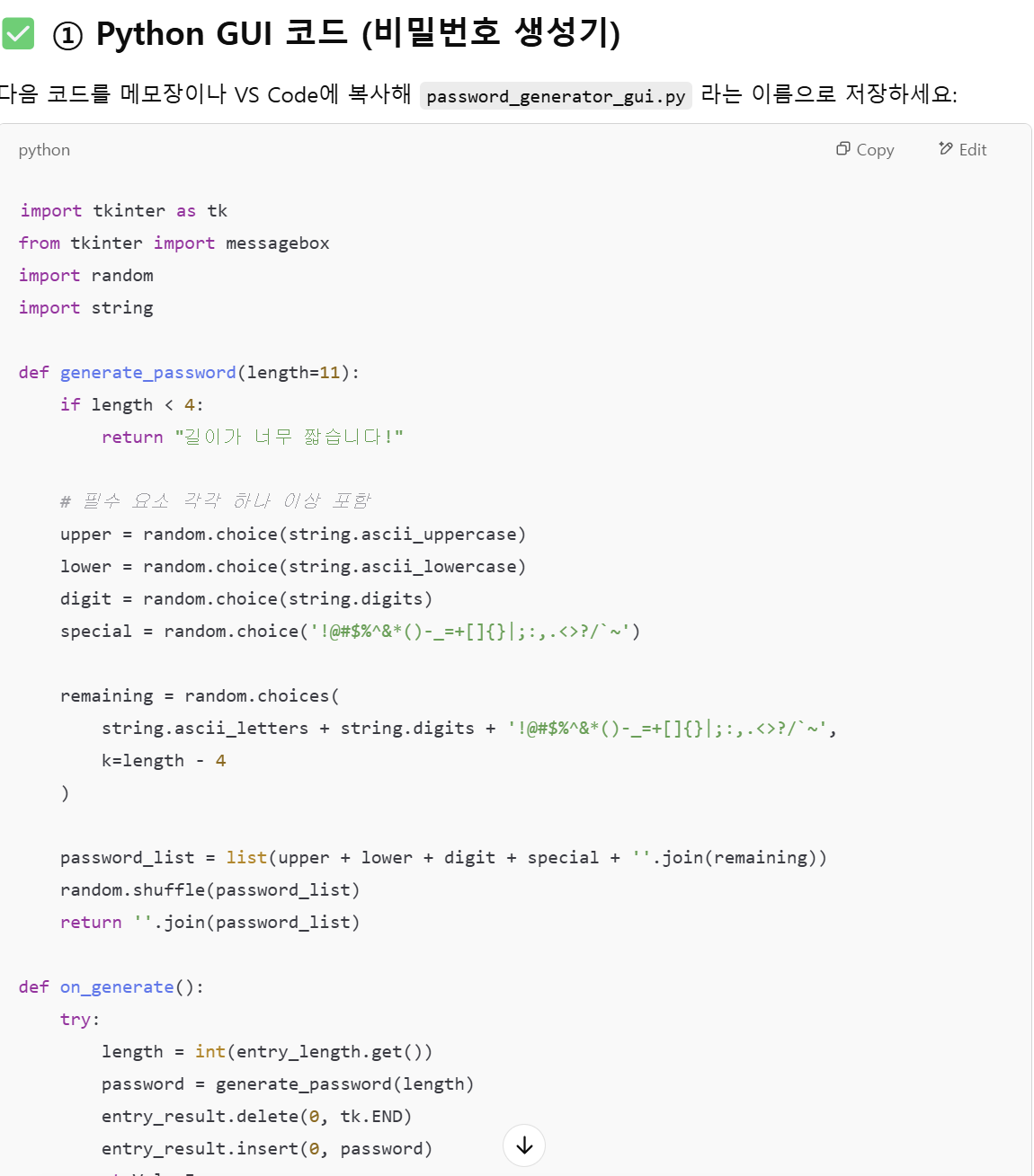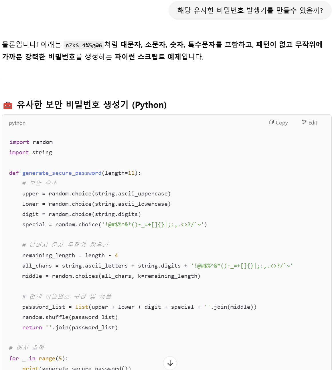 파이썬을 이용하여 비밀번호 생성기를 만들 수 있는 소스 코드를 알려주었습니다.