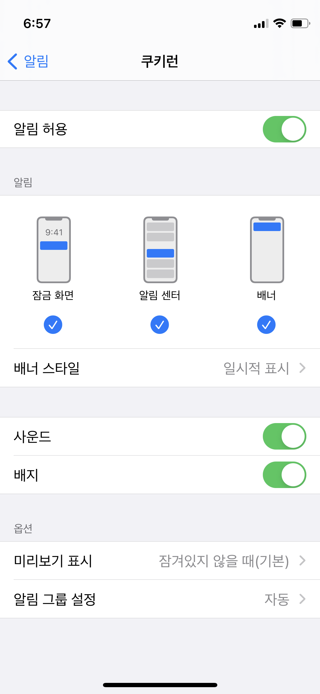 설정-알림 에서 미리 보기 상단의 미리보기 표시를