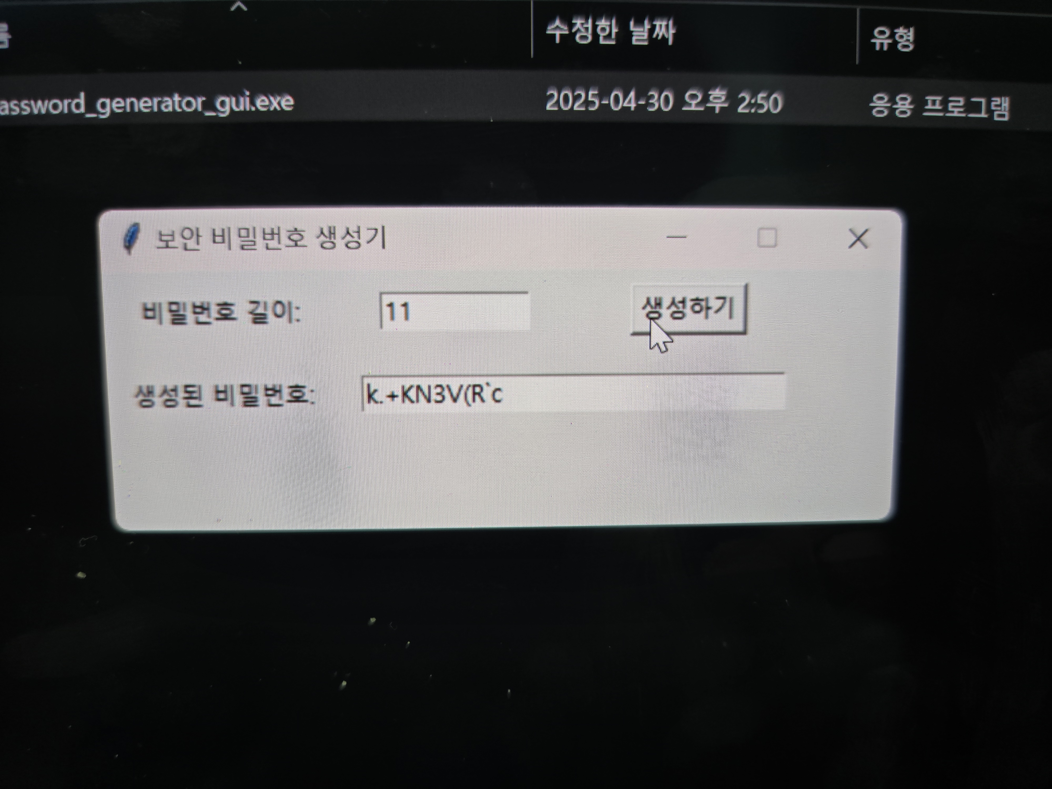 생성버튼을 누르면 비밀번호가 무작위로 생성되며 클립보드에 자동으로 복사가 됩니다.