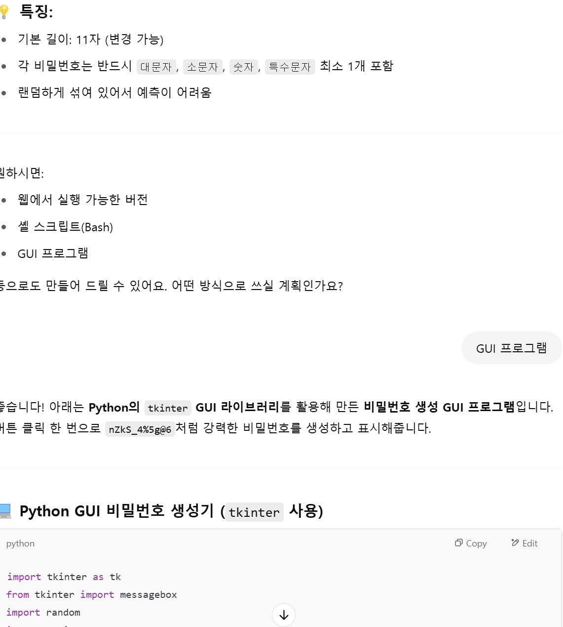 파이썬을 이용하여 비밀번호 생성기를 만들 수 있는 소스 코드를 알려주었습니다.